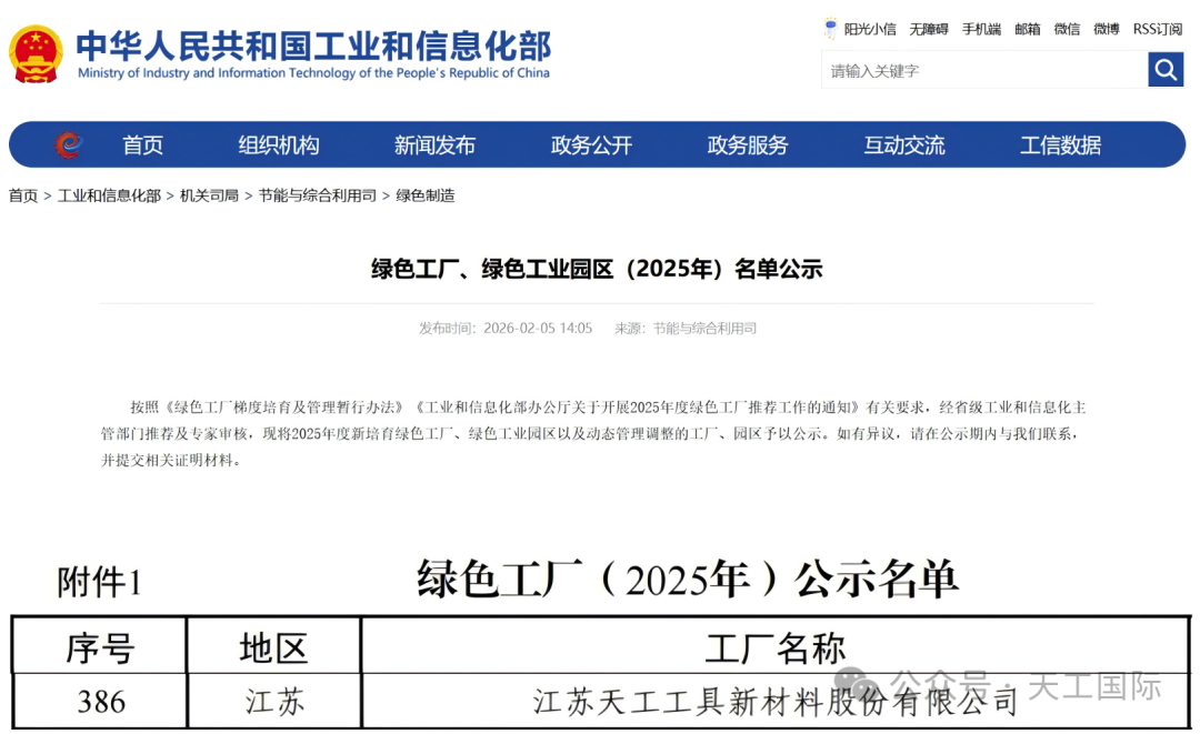 近日,工业和信息化部正式公示“绿色工厂、绿色工业园区(2025年)名单”。天工国际旗下江苏天工工具新材料股份有限公司(以下简称:天工工具新材料)凭借扎实的绿色生产基础、先进的环保技术实力以及坚定的低碳发展理念,成功入选国家级绿色工厂!这一荣誉不仅是国家对企业绿色制造水平的高度认可,更是公司深耕绿色发展、践行高质量发展理念的生动见证。