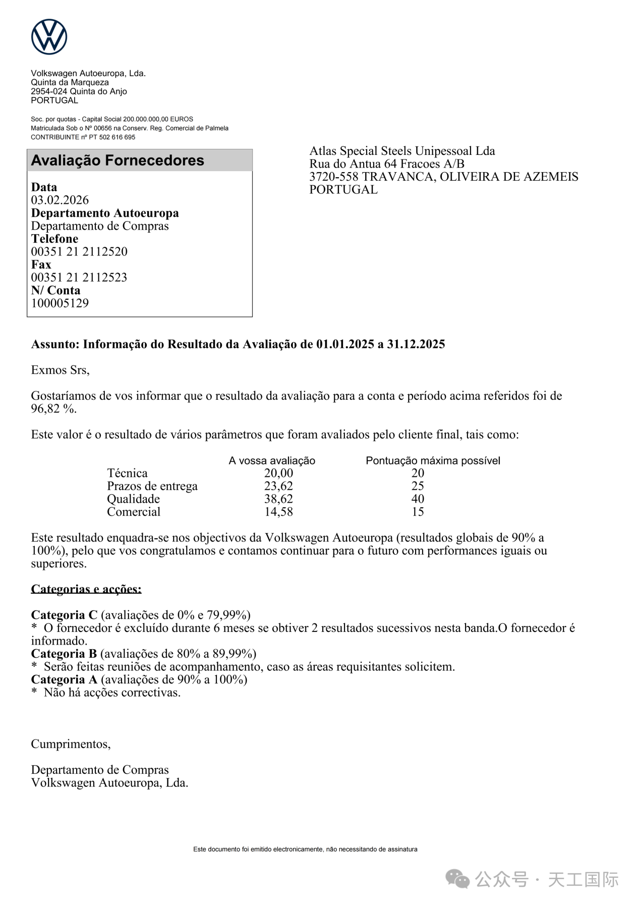 实力加冕,不负信赖!近日,天工国际特约经销商Atlas Special Steels Unipessoal Lda(以下简称“Atlas”)收到大众汽车葡萄牙工厂的供应商评估通知,天工国际供应的产品,助力Atlas以96.82%的优异得分获评大众汽车2025年度A级供应商!公司产品完美契合了大众汽车对全球供应商产品要求的核心目标,标志着天工国际产品品质与技术实力,获得国际头部车企高度认可!