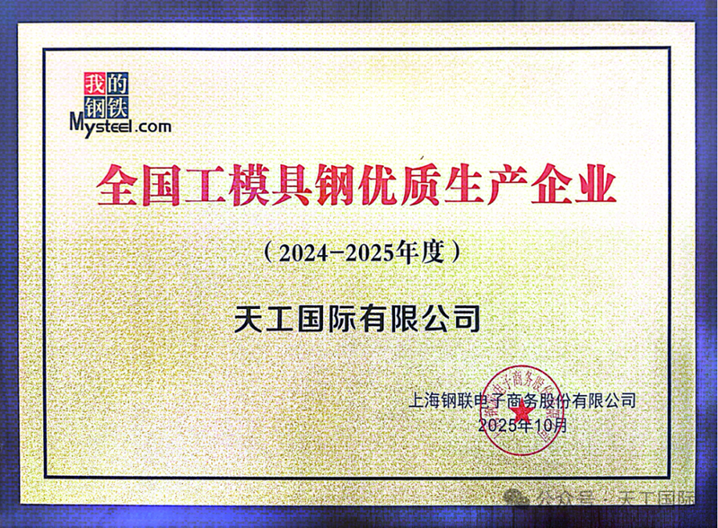 近日,由上海钢联电子商务股份有限公司组织评选的“全国工模具钢优质生产企业(2024-2025年度)”名单正式公布,天工国际有限公司凭借在工模具钢领域的卓越品质、领先技术与显著的市场影响力,成功入选该权威榜单。