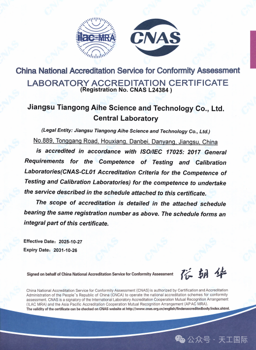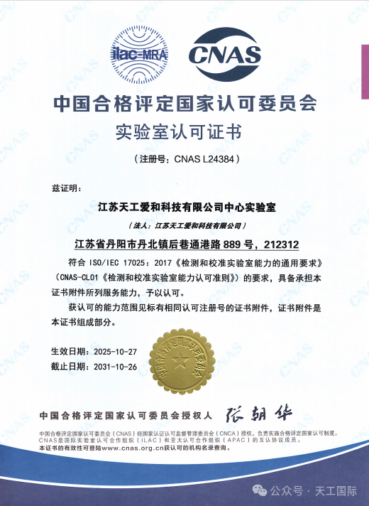近日,中国合格评定国家认可委员会(CNAS)正式授予江苏天工爱和科技有限公司中心实验室(天工爱和中心实验室)国家认可实验室资质,认可注册号为 CNAS L24384。这一资质的取得,标志着天工爱和在实验室管理体系建设、技术能力与检测水平方面已全面达到国家及国际认可标准,具备出具权威、准确和国际互认的检测数据的能力。