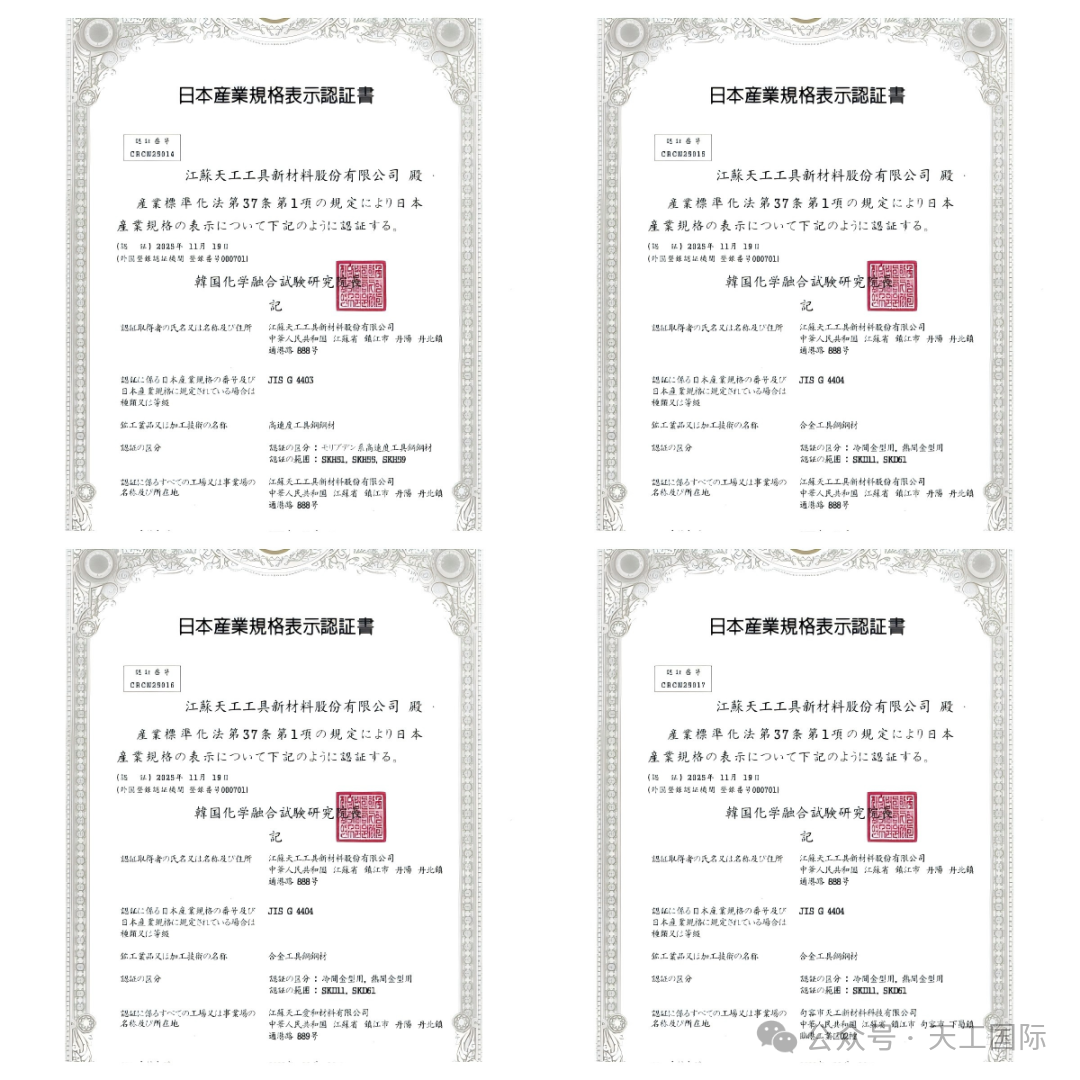 近日,天工国际有限公司下属企业江苏天工工具新材料股份有限公司(以下简称:天工工具新材料)顺利通过韩国化学融合试验研究院(KTR)的严格审核,正式获得 “JIS G 4404 合金工具钢” 与 “JIS G 4403 高速工具钢” 两项认证。这意味着天工工模具钢产品在化学成分、性能指标、制造工艺及质量管理体系等全流程,已全面对标日本工业标准(JIS)这一国际高端制造领域的顶级标准体系。